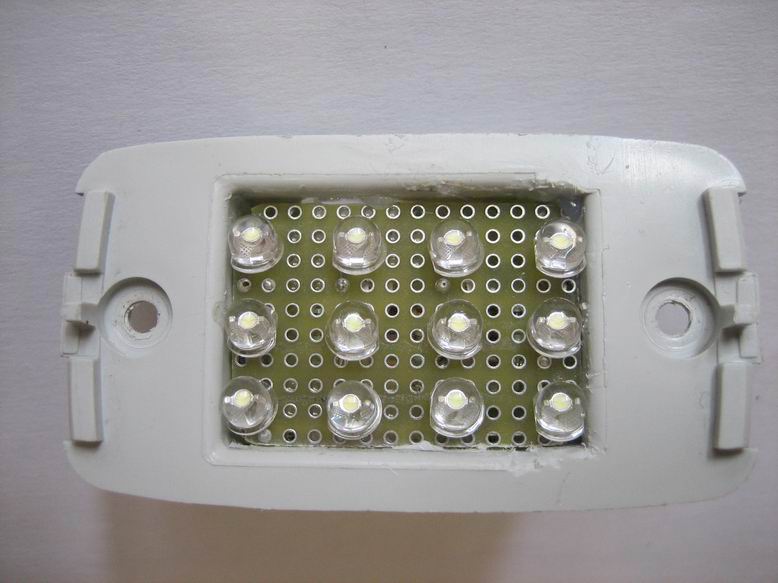 По фоткам: Использованы широкоугольные диоды. Припаяны под наклоном вниз. Плата приклеивается термоклеем из пистолета. Сделано 4 цепочки по 3 светодиода. Врочем на фотках все отлично видно :)