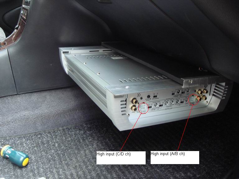 Усилитель похоже 4-х канальный. Подключай лучше через обычные экранированные кабеля RCA.