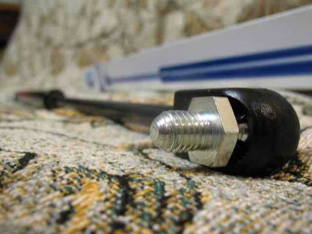 На обоих концах свободно вращающиеся болты M8 с интегрированными гайками под 13-й ключ Тут партномер и предупреждение. После установки капот становится почти вертикально в полностью открытом состоянии. Это серединное положение равновесия. Если опустить - падает, если приподнять - открывается самостоятельно на полную. Для крепления стойки внутри этой скобы требуется гайка, которую сняли с нижнего болта оригинальной стойки и чуть-чуть подстучать молотком, если не совпадает с отверстием. В этой же скобе, после высверливания родной шпильки отверстие пришлось увеличить до 8мм. При этом гайки, как писал Xazarы4, стачивать не пришлось.