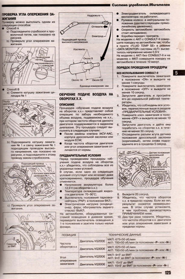 Воспламенение для A/T: 10 плюс-минус 5 ° BTDC (в положении селектора в положении \"P\" или \"N\")
