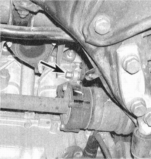 Вид снизу. Справа видно крепление переднего сайлента нижнего рычага подвески. Просто на фотке штаны выхлопной системы сняты. Там, где начинается стрелка, - фланец выхлопного коллектора. Там очень тесно и неудобно. Но обыкновенным накидным ключем на 14 у меня получилось. Сама гайка у меня желтая. То ли пасивированная, то ли бронзовая. Колпачковая.