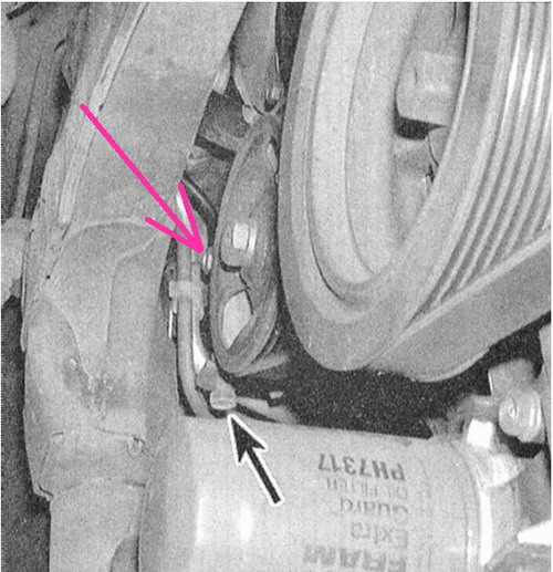 2. Ослабляем контрогайку натяжного механизма. Или болт, не помню. Отметил по памяти розовой стрелкой. Может и не она, но найдешь сам. Я это делал три года тому назад, мог и подзабыть.