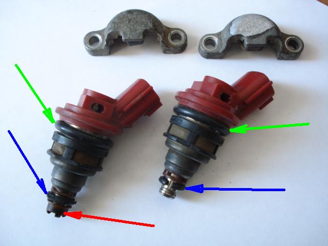 Чтобы заменить нижнее кольцо нужно снимать пластиковый колпачок (красная стрелка),но при снятии он рассыпается(на одной форсунке у меня уже рассыпался видно на фото), возможна ли нормальная работа форсунки без этого колпачка, и есть ли они отдельно в продаже? Как меняется верхнее кольцо (зеленая стрелка), и меняется ли оно вообще?