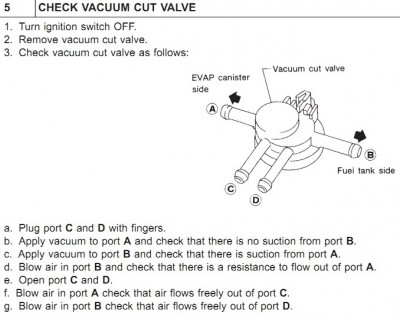 Это что такое? На абсорбере вроде у меня нет каких либо клапанов. Это просто коробка. Если речь про VACUUM CUT VALVE (см. картинку), то я его работу проверил. Работает, как описано в мануале.Egor 789 писал(а):Еще обязательно проверь обратный клапан на абсорбере, он должен пропускать топливные пары только в одну сторону от бака