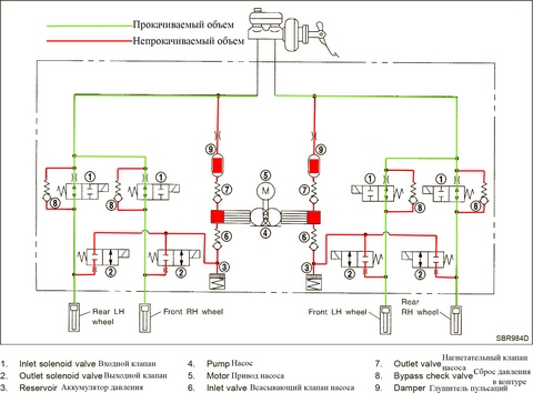 1. Воздух в системе еще ЕСТЬ (педаль после заводки двигателя сразу становится более резиновой, чем сразу после прокачки с отключением и без отключения клеммы аккумулятора), но удалить этот воздух я по какой-то причине уже несколько лет не могу (масштабно этим занялся только сейчас). Полагаю, этот воздух "гуляет" внутри сборки ABS-модуля. При рассмотрении схемы (см. в приложении) обнаружил, что при ОТКЛЮЧЕННОЙ ABS положение клапанов не обеспечивает проток жидкости по всей системе ABS-модуля и не выносит оттуда воздух: зеленым обозначил прокачиваемые магистрали и красным - НЕпрокачиваемые, т.е. потенциально в них МОЖЕТ (но не обязан) остаться/скопиться воздух после полного и длительного (пара дней) опорожнения системы гидропривода. Не имею представления насколько велик объем этих линий и рабочей полости насоса, клапанов. Внутренности ABS подробно не видел.