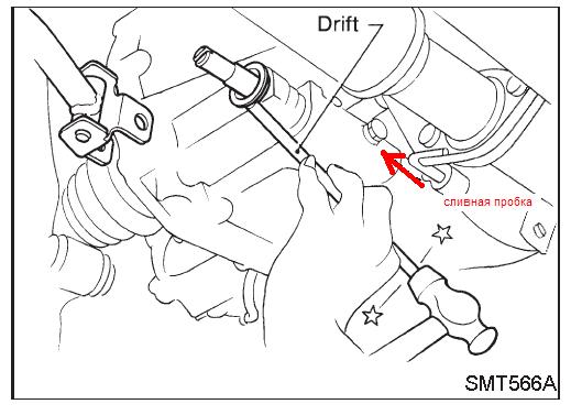 Точно, выкрутили что не надо. Сливная пробка находится сзади сбоку. Примерно там, где тяга от "ручки" подходит к коробке. Ключик на 12 и все сливается.