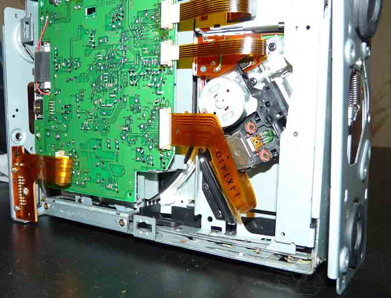 Перед снятием чейнджера нажал на кнопку eject на блоке с дисками, он выехать отказался, вроде пытается, но не может. Короче снял сей замечательный агрегат, все заняло 5 минут, принес, разобрал. Смотрю вот на него и не понимаю мальца. На фото постарался показать. Из 6 ячеек под диски у кассетника 4 задвинуты внутрь него, а две выдвинуты наружу, вот только не с той стороны где головка оптическая считывателя, а с другой, через металлическую перегородку. Я практически уверен, что так быть не должно, но может чего-то не знаю, подскажите?..