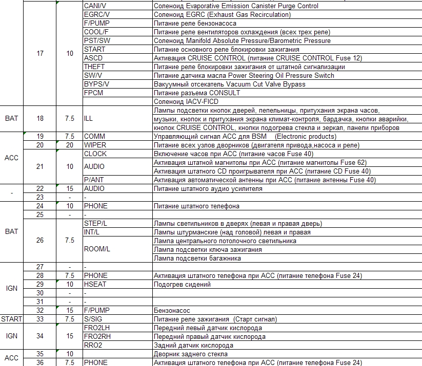 Maxima A32. полетел прикуриватель (не работает). решил сверить свои предохранители с этой таблицей. вот, что получилосьTrusishka писал(а): Вот, покопавшись во всех доступных мануалах, я составил таблицу предохранителей для A32.