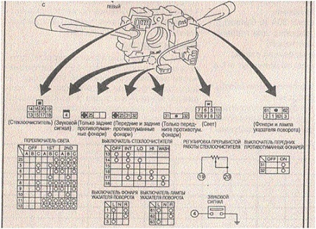 1.- белый разъём с тремя проводами (на рисунке четырёх контактный разъём, одно гнездо пустое) идёт для подсоединения переключателя передних/задних противотуманных огней - колёсика