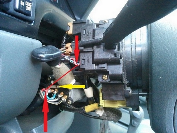 Сделал в выходные что задумал. Прикладываю фото. Необходимо обрезать провод указанный красной стрелкой сверху. Далее, если хотите чтобы туманки были полностью независимы то берете провод указанный желтой стрелкой, там плюс есть всегда, если от включения зажигания то указанный красной стрелкой внизу. Я сделал от зажигания, пробросил провод от зажигания к проводу который обрезал, приматываемся к тому концу, который уходит к колесику, красная полоса это условно что куда пробросил. Провод который остался после обрезания необходимо тщательно заизалировать, так как на него при включении габаритов будет приходить плюс. Провод зажигания можно или надрезать и прикрутить к нему провод или просто припаять к контактной платформе. Не знаю как фото получше выложить, ограничение стоит на форуме.