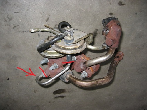 всем спасибо за фотки, огромнейшее. оказывается все не так уж сложно.по фоткам обнаружил отсутствие болтов, кроме тех, которые обведены красным. там где белым помечено-ничего не было. теперь новый вопрос. на фотографиях 2 и 3 указано место откуда дымом валит. что это такое и нормально ли? да еще и пердосвист оттуда идет. ужас как на холодную пукает. прокладки впускного и выпускного коллекторов менял-шум остался.((