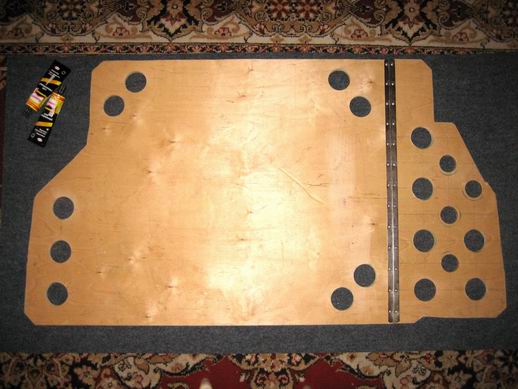 Приклепана рояльная петля (магазин OBI), чтобы конструкция влезала в багажник, т.е. конструкция раскладная. Сверху на фанеру наклеен тонкий легкий ковролин на резиновой основе (магазин OBI) серенького цвета в цвет багажника. Приклеен клеем момент.