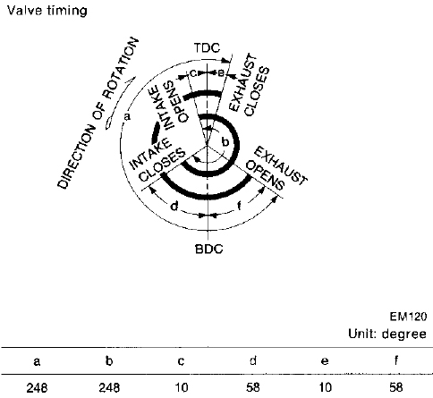 Видим из диаграммы: "b" - клапан впуска открывается за несколько (="с") градусов до ВМТ. Закрывается после прохода через НМТ. Примерно где то около 200-220 всего градусов впуск открыт.