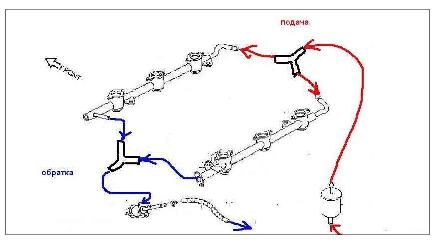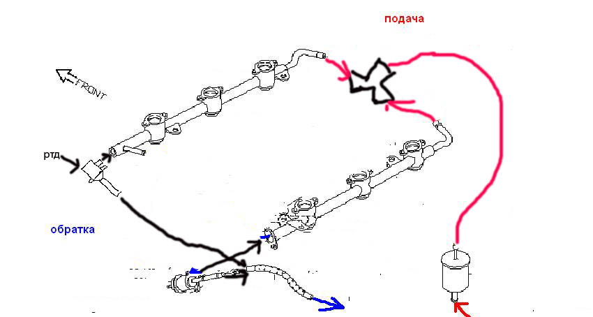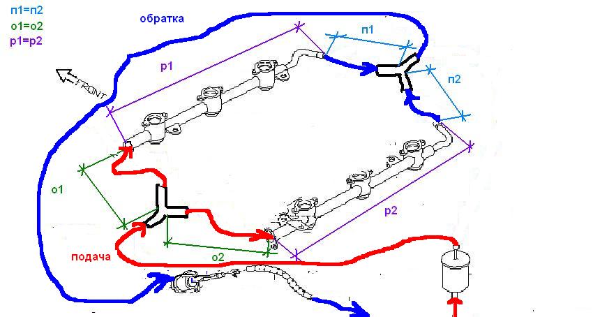 Теперь про твою схему. Спалишь нах переднюю башку. Давление в рампе создаёт РДТ, а у тебя в рамке передней башки этого давления нет. К тому же ты закольцевал так, что у тебя в каждом тройнике подача встречается. Из этого ничего хорошего не выйдет. У трубы два отверстия: в одно заливается, через другое сливается. И никак иначе. Невозможно сделать так, чтобы в одно отверстие и вливалось и выливалось, тем более под давлением.