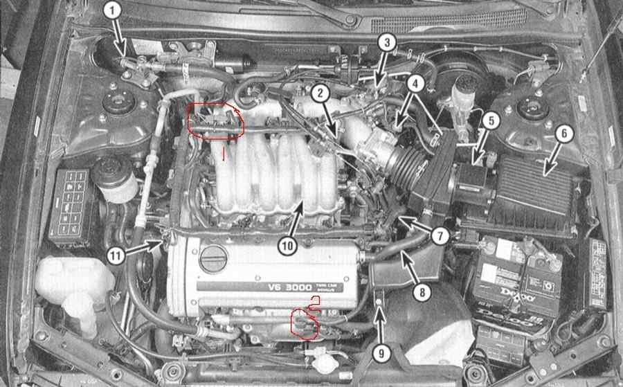 Первый над всасывающим коллектором возле первой катушки, второй между двигателем и вентилятором радиатора напротив надписи 3000. Оба 3-ех. контактные