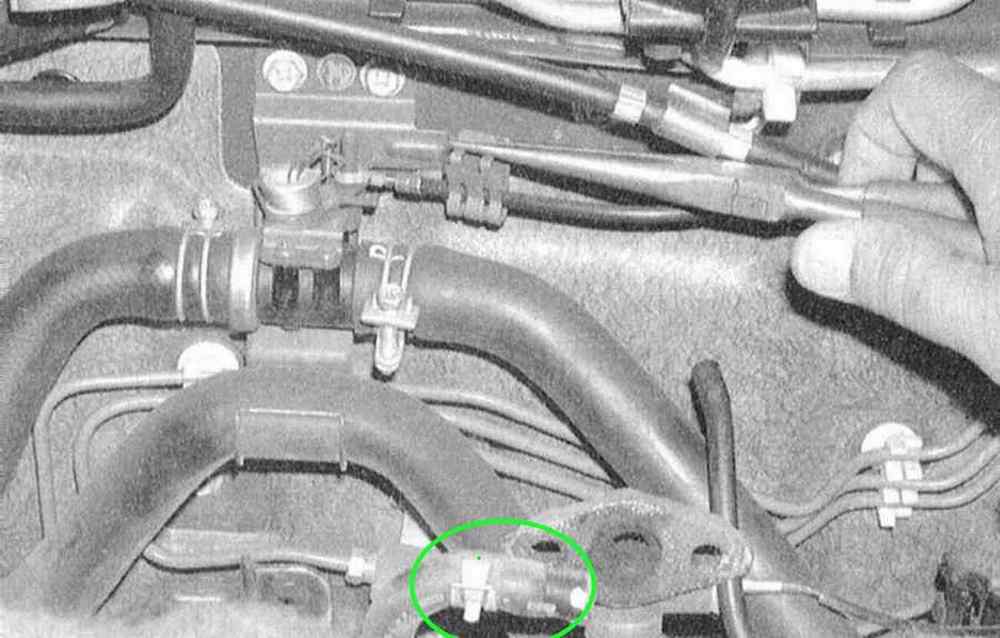 Правильно, на всасывающем коллекторе в районе трубки от системы EGR (на фото она рядом с выделенным шлангом, который тебе и нужен) под этой трубкой есть "переходник трубка" по ней циркулирует тосол я думаю для обогрева. Когда снимают коллектор этот резиновый шланг тоже нужно снимать, одеть его легко а вот хомут надеть сложно(даже ускогубцими не всегда удается). Я ставил простой хомут под ключик на "6" или на "7". Чтобы было проще подлезть я снимал сборку со всеми клапанами(Х.Х, ГУРа и кондера).