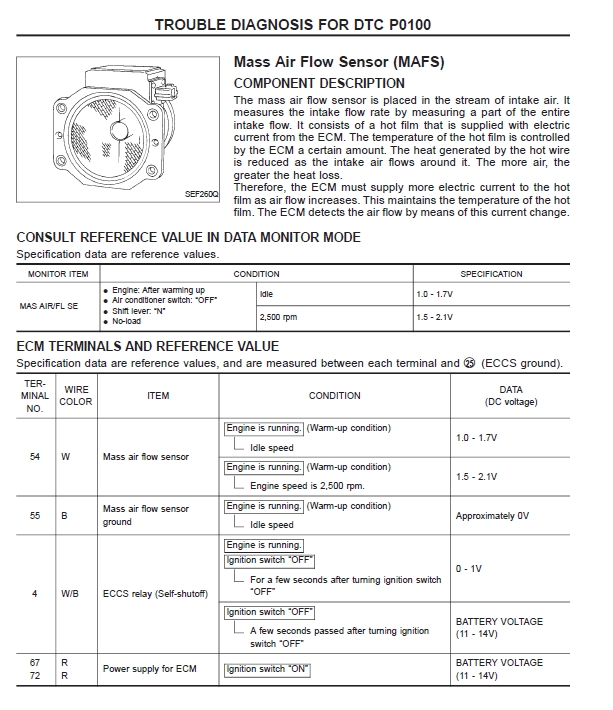 "4. Восстановите исходное подключение электропроводки к датчику maf и прозондируйте положительным щупом вольтметра клемму белого провода с обратной стороны контактного разъема (отрицательный щуп вольтметра заземлите на массу)(подробнее см. Главу Бортовое электрооборудование). При включенном зажигании (двигатель не запускайте) здесь должно иметь место напряжение около 0.5 (1993 и 1994)/1.0 (с 1995) В. " (http://automn.ru/nissan-maxima-qx/nissa ... d-788.html).