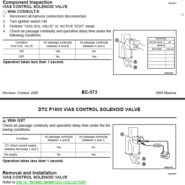 предохранитель этот связан с ошибкой DTC P1800 VIAS CONTROL SOLENOID VALVE, скорее всего коротит сам клапан SOLENOID VALVE, отключи его, а лучше проверь вполне возможно машина не ехала из за клапана, его работу можно так же проверить консалтом, после устранения КЗLandShark писал(а):... консалт и он показал 2 ошибки: Р1800 (че то там с каким то магнитным соленоидом VIAS вроде) и Р0306(типа не было зажигания в 6 цилиндре). ЕЩЕ заметил сгоревший предохранитель 15А под капотом- ENG CONT 1. Поставил новый, но при включении зажигания он сразу сгорает...