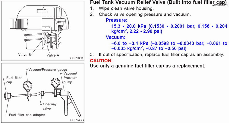 Практика на моей Maxima показала, что со временем значения давлений, при которых должны срабатывать эти клапана, могут измениться и превысить допустимые. В моем случае «залип» клапан №2. В результате чего он не пропускал свежий воздух при превышении допустимого потолка в -6,0 кПа и глубокое разрежение в бензобаке приводило к тому, что бензонасос не мог создавать необходимое давление топлива. Последствия в виде тупого двигателя всем понятны. А если залить полный бак и отправиться в дальнюю дорогу за один заход, то можно и вовсе получить «плоский бак».